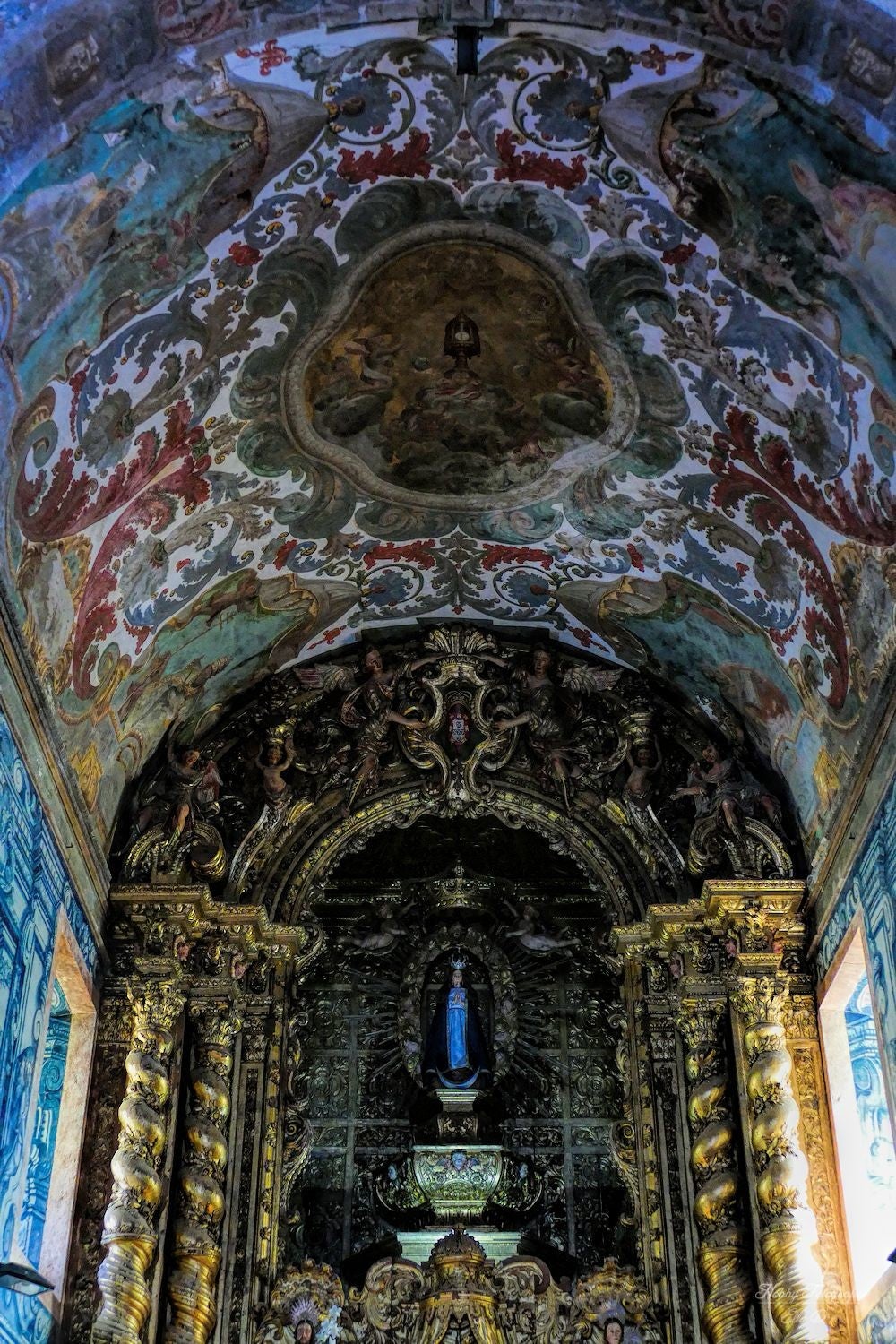 Hij was open en binnen is het werkelijk een plaatje zoveel te zien, je weet niet waar je kijken moet...Alles is betegeld met Azulejo`s ...grote voorstellingen,veel houtwerk